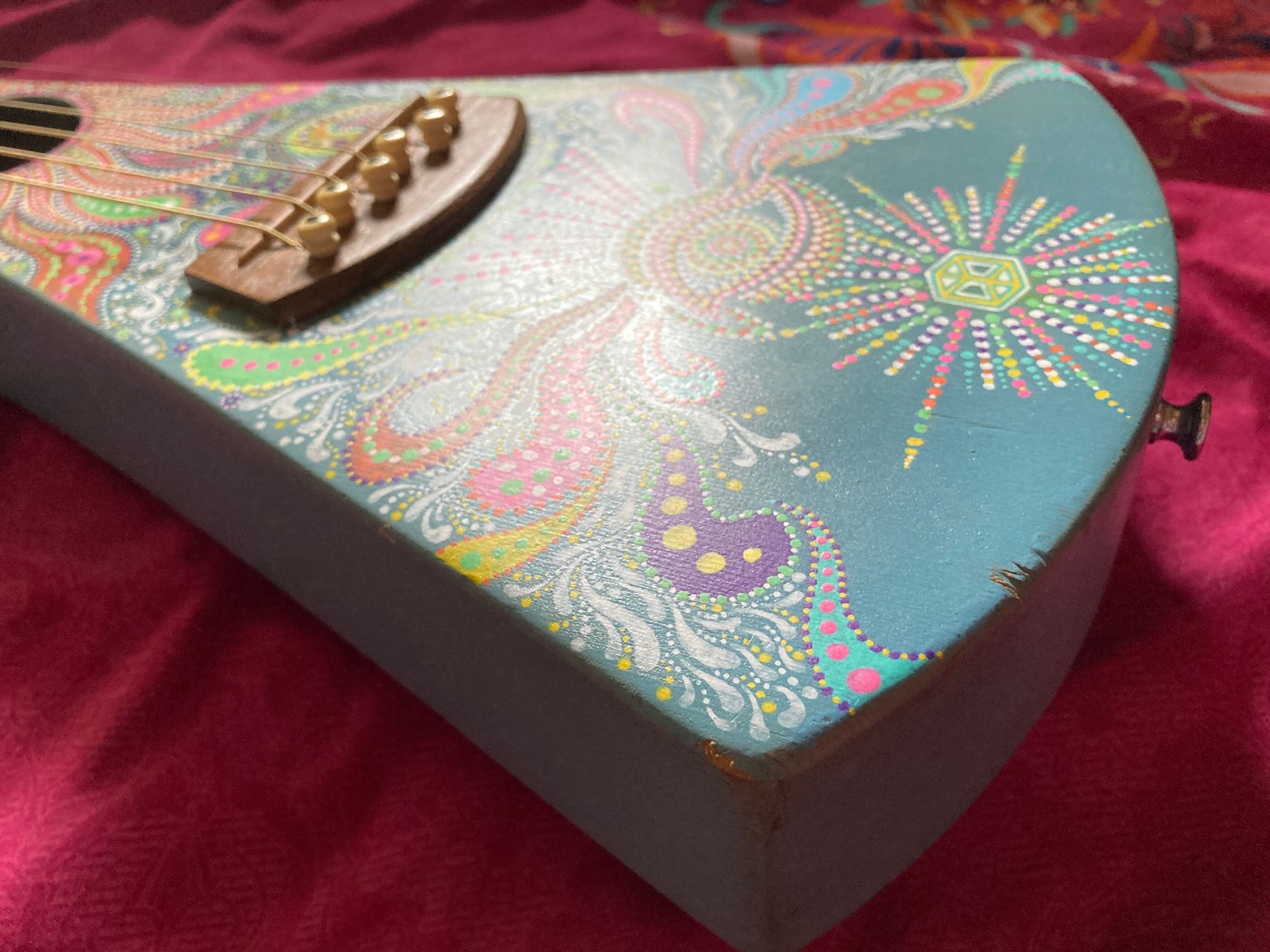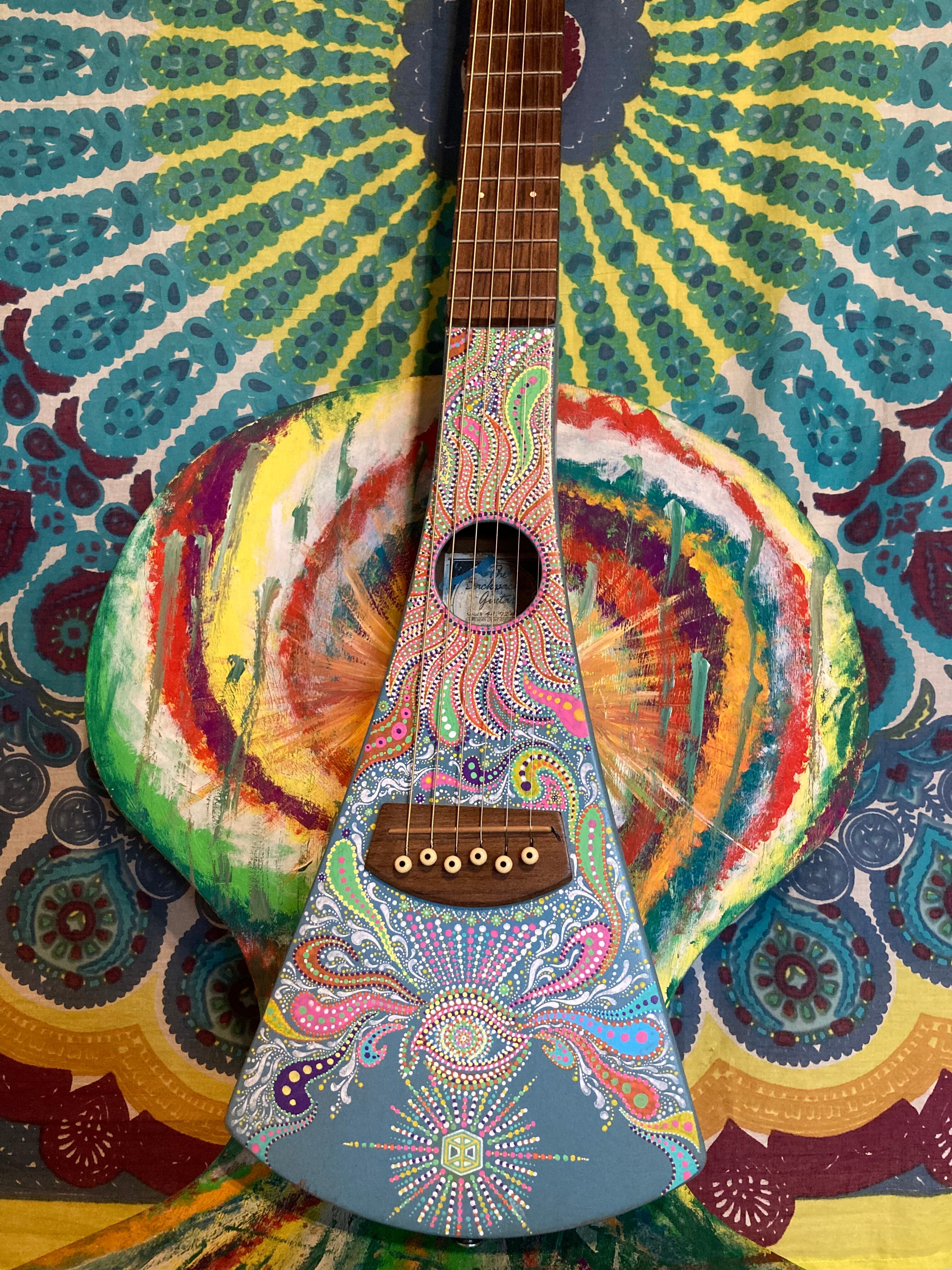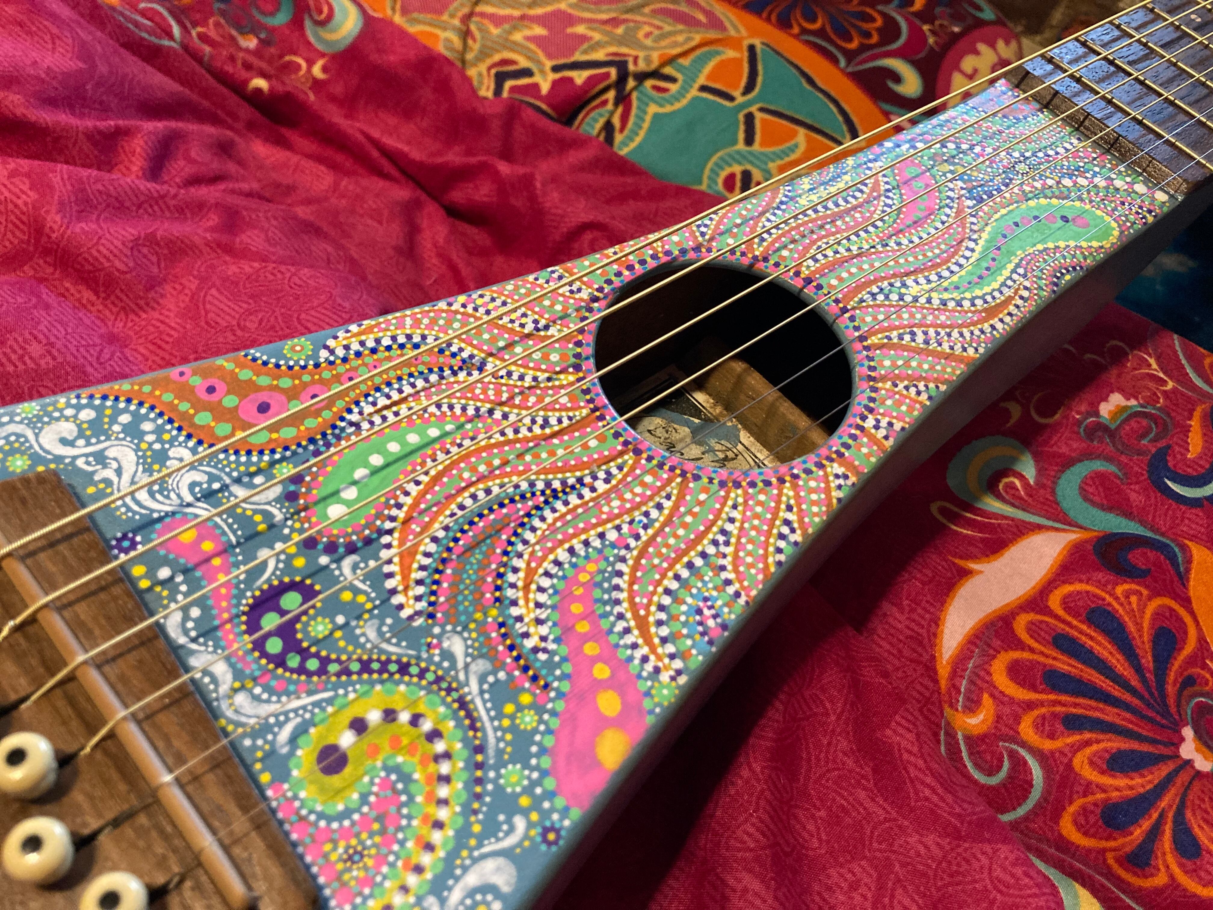 Martinのバックパッカーという、その名の通りギターを持って旅をする為に作られた、非常にコンパクトで軽いモデルに絵を描きました。